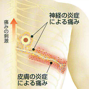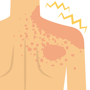 帯状疱疹は、はじめにピリピリとした痛みや虫刺されのようなかゆみを身体の左右どちらかに感じます。神経の走行に沿って片側だけに赤い発疹や水疱(水ぶくれ)が帯のように現れるのが特徴で、胸から背中や顔、頭、首ににかけて症状がでることが多いです。