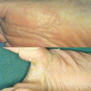 角質増殖型は表面がザラつき足の裏全体の皮膚が硬くなり、ひび割れやアカギレのようになる乾燥する冬に痛みが出ることがあります。