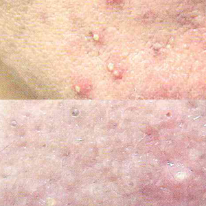 尋常性ざ瘡は一般的にはニキビと呼ばれています。皮脂(皮膚のあぶら)が毛穴にたまった状態で常在菌のアクネ菌(にきび菌)が増殖し炎症を起こします。